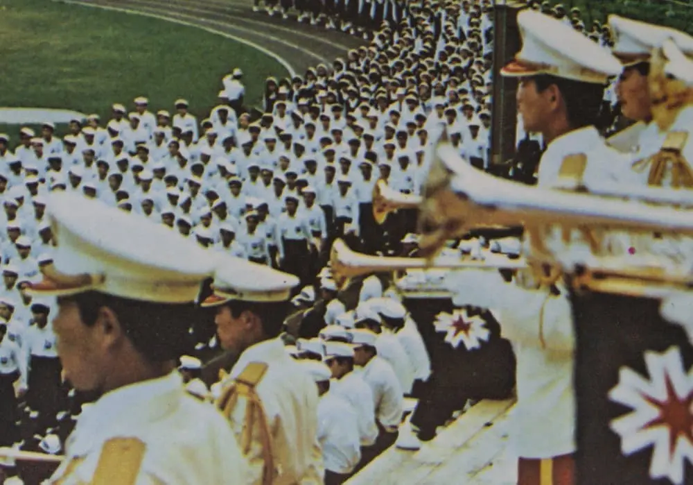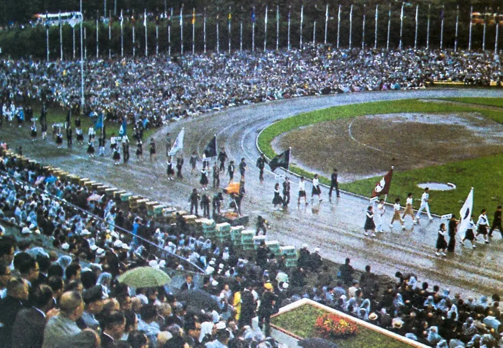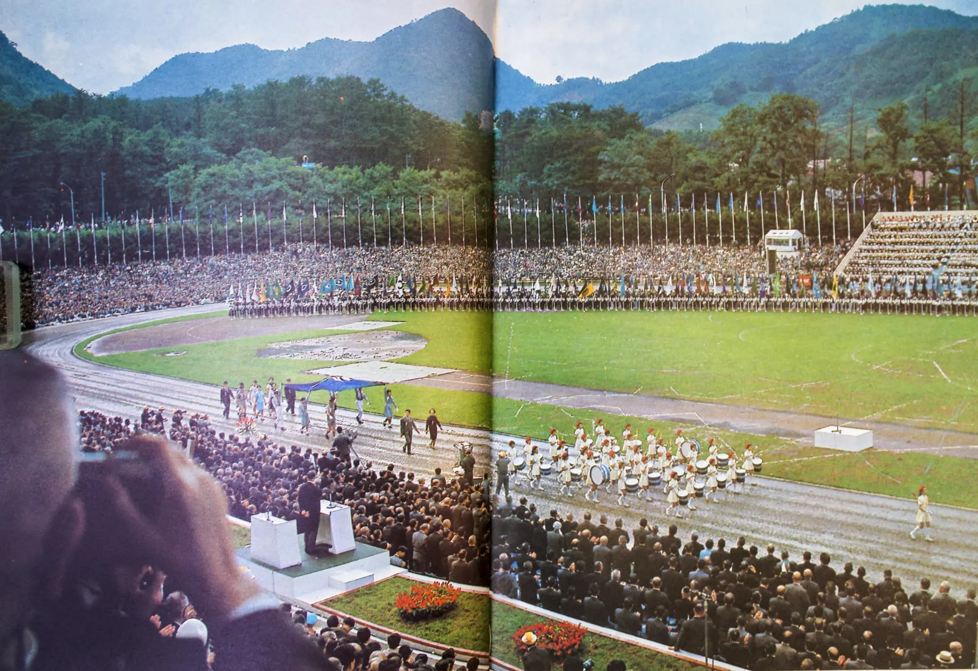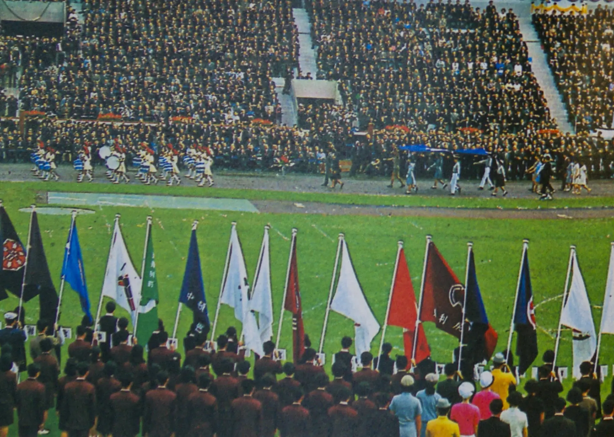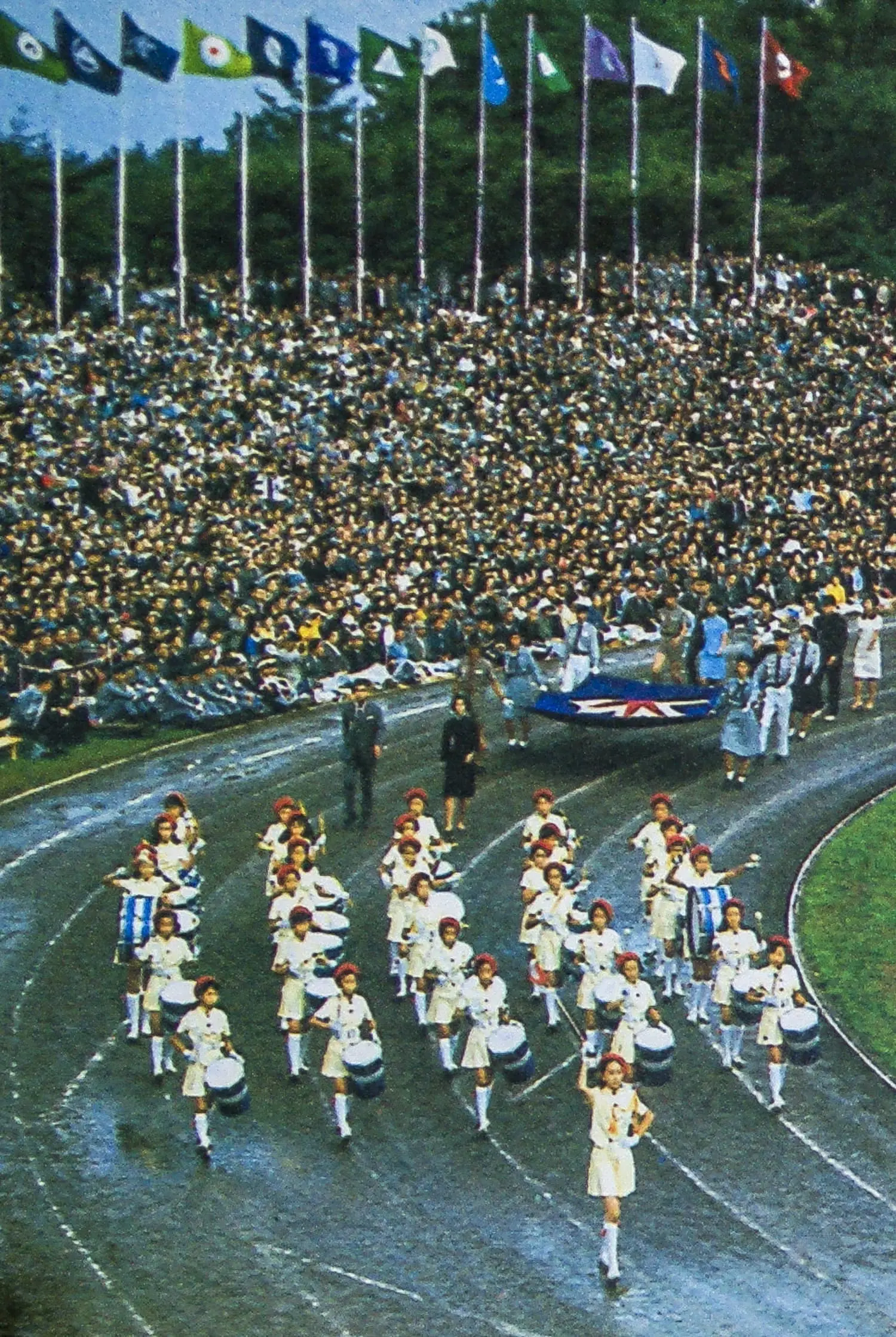 13時30分、音楽隊1600人の入場―吹奏楽の各団体、陸上自衛隊のファンファーレ隊と音楽隊、道警音楽隊に続いて札幌市内高校生男女1000人の合唱隊が、おりからの雨しぶきの中に美しい色模様を描いて場内を一周、メインポール下の音楽隊席についた。
