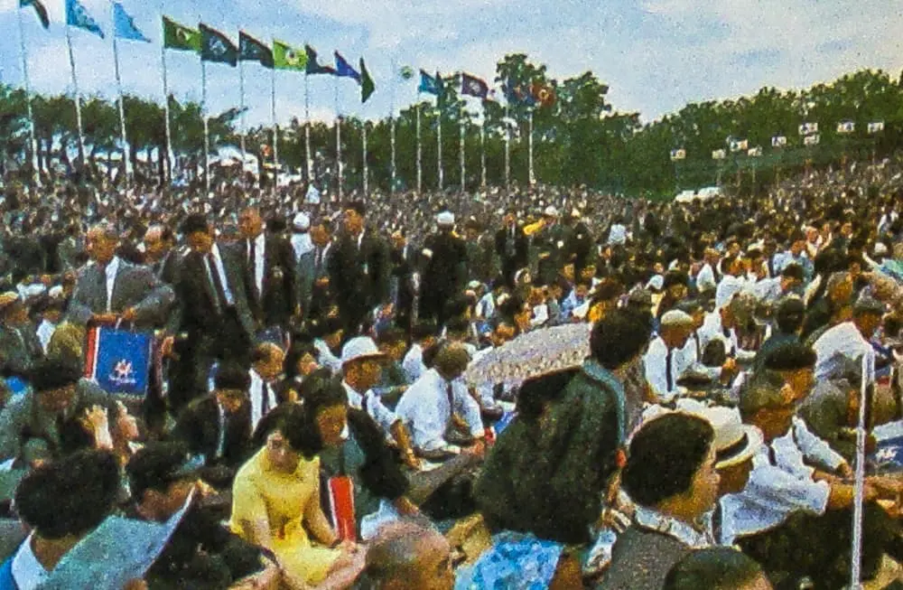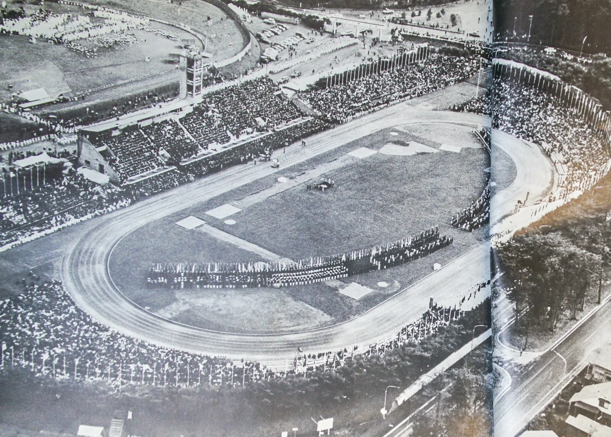 雨足がいく度か通りすぎたが参列者の足は引きも切らず、2万人を収容する一般参列者席はほどなくいっぱいになった。参列券なしに早くから詰めかけていた人も多く、その熱意にこたえて場内トラックの一部に砂を入れ、敷き物を敷くなど、応急の座席も作られたが、なおはいりきれない数百人が場外の高い道路上に鈴なりに立ち並び、あるいは土手に登っていた。