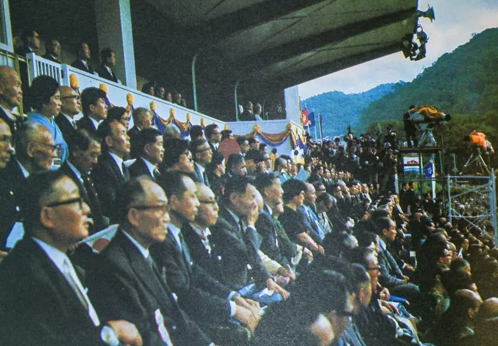 北海道百年記念祝典は、昭和43年9月2日、天皇・皇后両陛下をお迎えして、札幌市円山陸上競技場で2万人の列席者を集めて挙行されました。この日の模様を『北海道百年 記念事業の記録』(1969)より再現しましょう。佐藤栄作総理大臣以下三権の長、国会議員、都道府県知事などが出席したそれは国家を挙げた祝典、オリンピック開会式をも上回る空前のページェントでした。