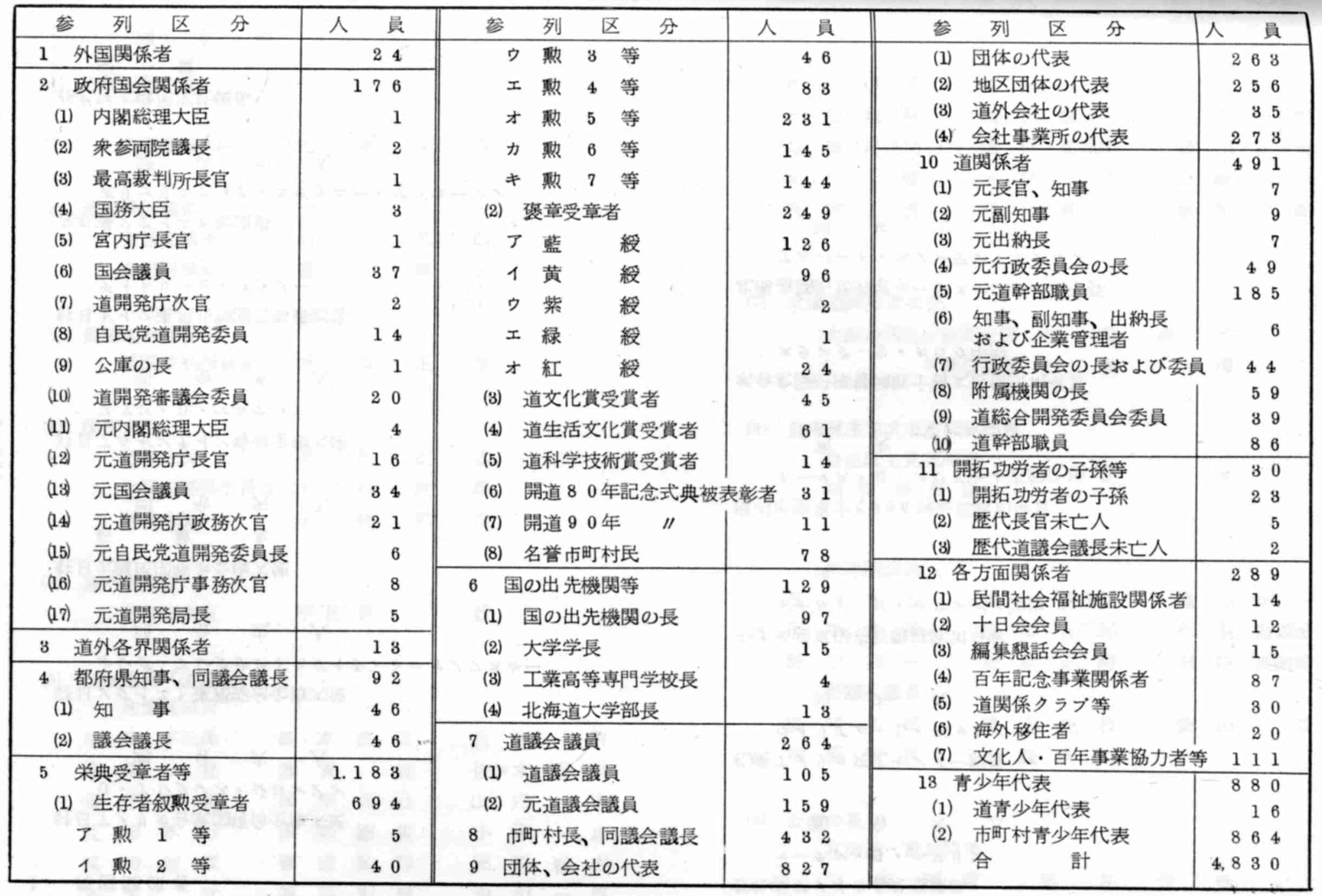 メインスタンドを埋めた約4000人の特別参列者のなかには礼装にとりどりの勲章をつけた晴れ姿が多く、また明治初めの開拓顧問ホーレス=ケプロンの孫アルバート=スノーデン=ケプロン夫妻、北海道酪農の偉大な父エドゥウィン=ダンの子息夫人ダン道子さん、第3代開拓長初代北海道庁長官官黒田清隆の孫常清氏、岩村通俊の孫一木氏の代理、第2代同長官で屯田兵制度育ての親でもあった永山武四郎の三男武美氏ら開拓功労者の子孫。
