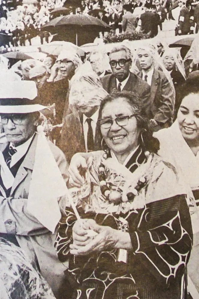 しかし、実際には特別参列者として野村義一北海道ウタリ協会長は招かれていていることに確かな記録があります(北海道百年記念施設建設事務所「北海道百年記念事業記録資料編」1969・322p)。写真のアイヌ婦人も、原則としてこの式典の参加者は招待者なので、市町村代表もしくは何らかの団体の代表として招待された方です。〝「北海道百年」がアイヌを無視した祭典である〟というのは全くの事実ではないことを覚えておきましょう。