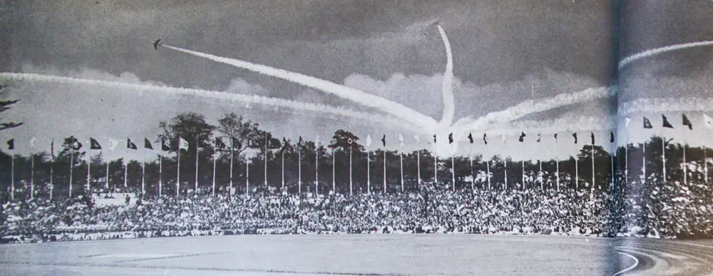 メインスタンド式台に立つ町村道知事、その下に居並ぶ全市町村長をはじめ全参列者が、若ものたちの力強い足どりのうちにこもる北海道の果てしない前進の足音を聞く。