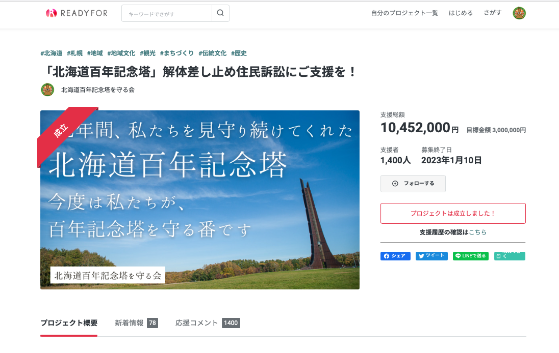 北海道百年記念塔を守る会の野地秀一です。この度は、百年記念塔解体差し止め訴訟費用捻出のためのクラウドファンディング(CF)にご協力賜り本当にありがとうございました。ボランティアの方々、伴走してアドバイスを頂いたレディーフォー社の方々、全ての人に感謝申し上げます。金額は一千万円を超え、支援者数1,400名という本当に予想していなかった多さにスタッフ一同、本当に驚いております。