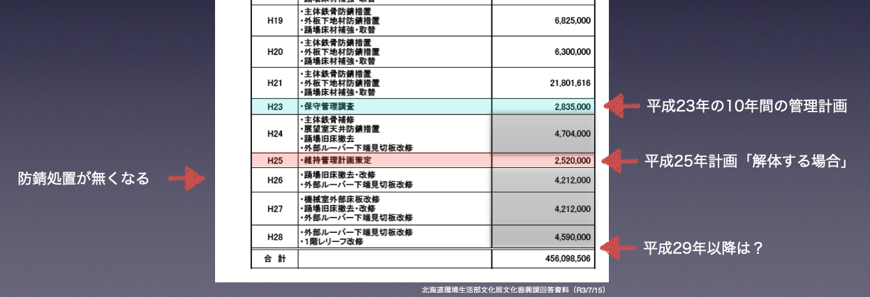 実際に解体が決定されたのは平成30年頃ですが、その何年も前から維持管理を怠ってきているわけですよね。地方財政法違反であると、不作為もしくは意図的に道民の財産を傷めたという指摘もあるわけでございますけれども、解体が決定される前になぜ維持管理費を減らしてきたか、という説明を今日は聞かせていただきたい。