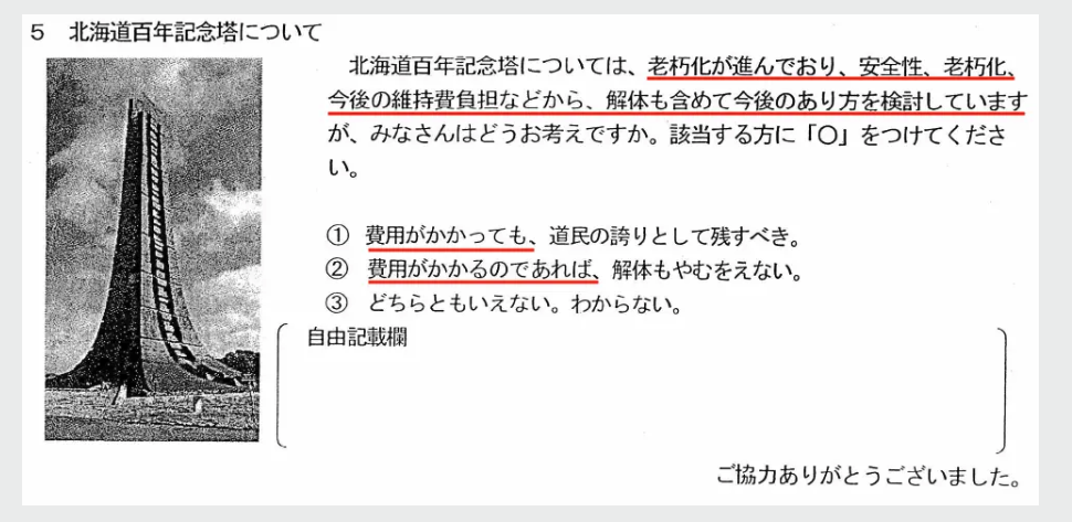 もはや解体しかないという風に進んでいくというのは、あまりにも拙速であると考えます。当然道民の方々を第一として広く議論を集めるべきでありますし、私達としてはその結果、北海道開拓の歴史を子々孫々に受け継ぐために、現在の塔を存続させることが必要であると思います。