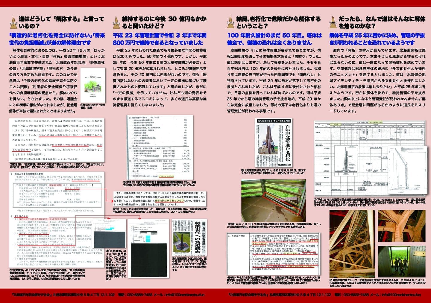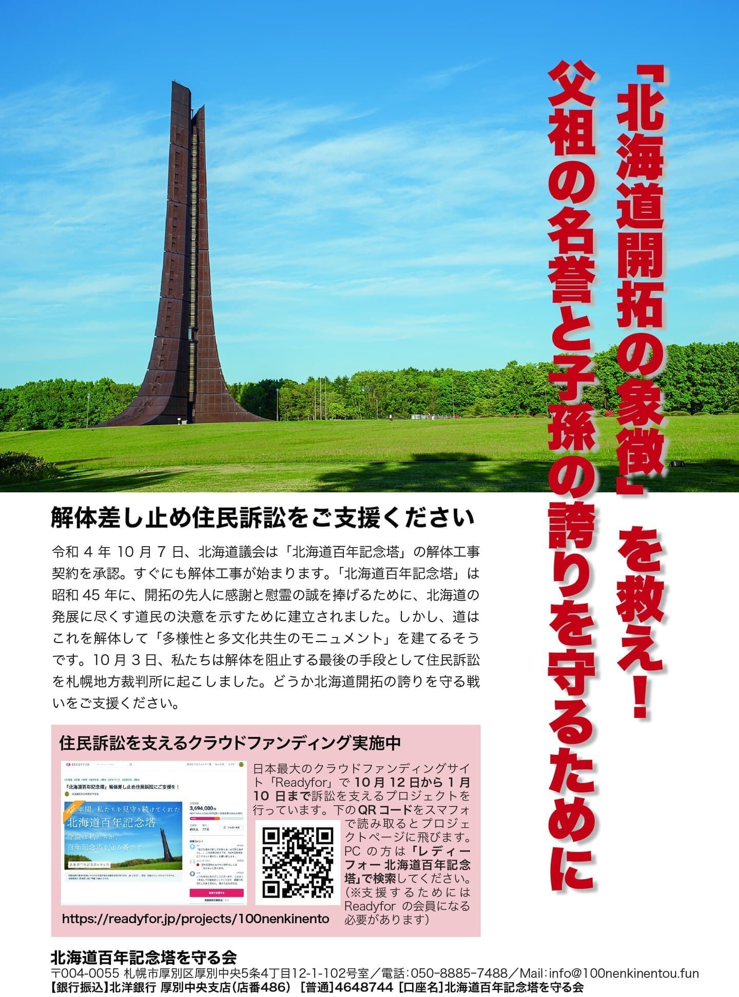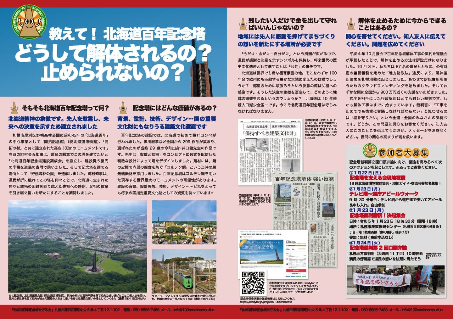 北海道百年記念塔解体差し止め住民訴訟と訴訟支援クラウドファンディングを紹介するパンフレットのデータを公開します。Jpeg、PDFデータを公開します。自由にご活用ください。PDFデータは商業印刷にも対応したトンボ付きデータも格納しました。