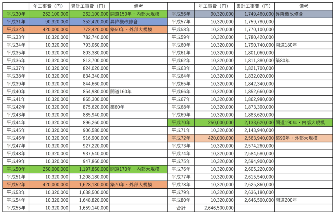 さて、平成29年調査は、これまでの実績によって20年毎に大規模修繕を行うとしていますが、これまでの実績に照らせば、今後50年で内と外で大規模修繕はそれぞれ1回行えばよいはずです。