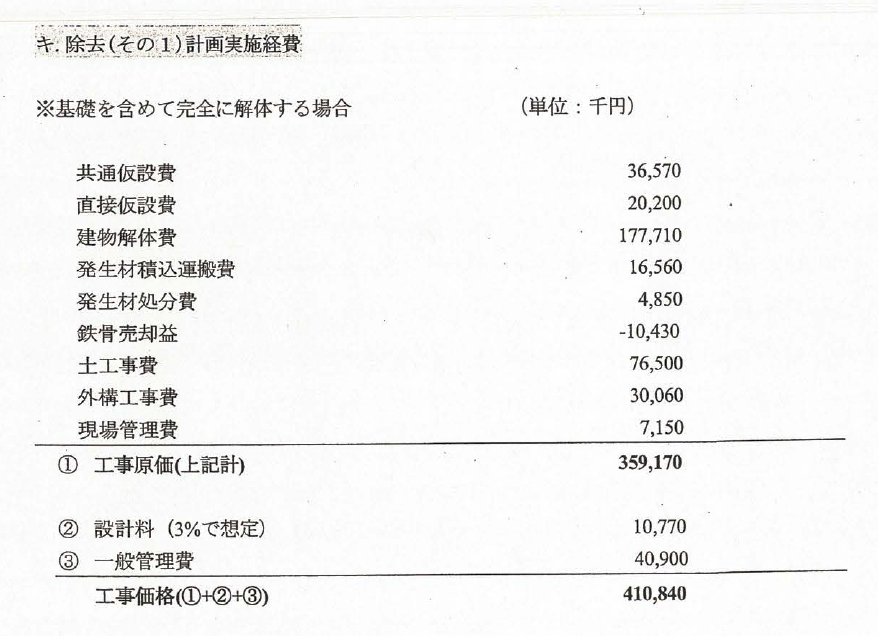 そうした下心が管理費に現れています。この調査には解体(調査報告書では除去)費用の調査も含まれている(むしろそちがメイン)のですが(引用④)、解体工事の現場・一般管理費の合計は4805万で全体の約11.7%ですが、現状維持補修の現場・一般管理費の合計は1億0904万円で全体の約16%。きれいに5%を上乗せしています。