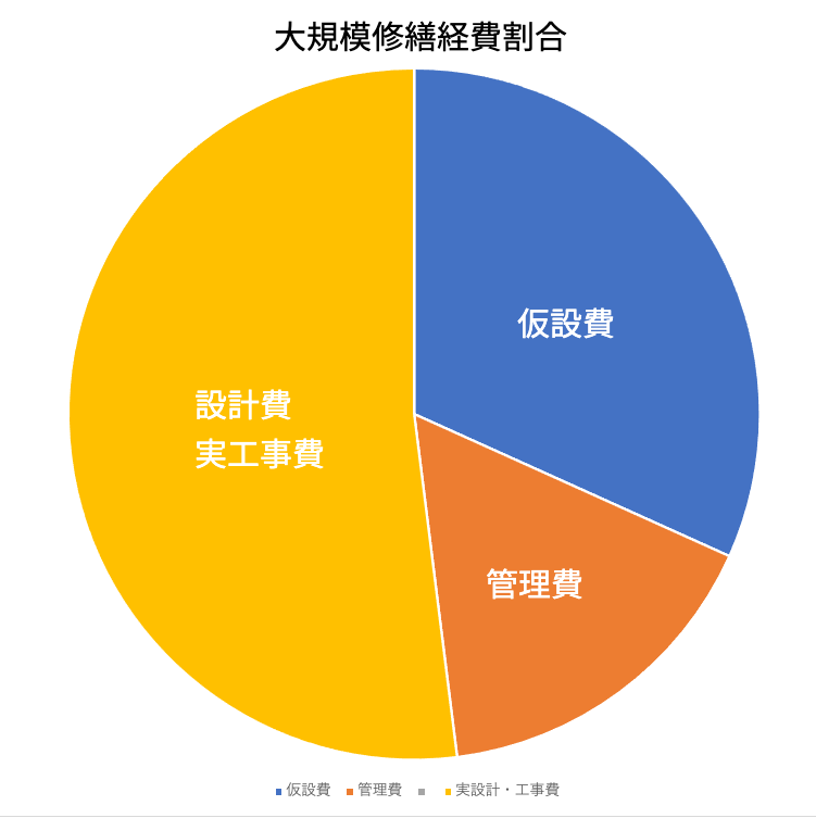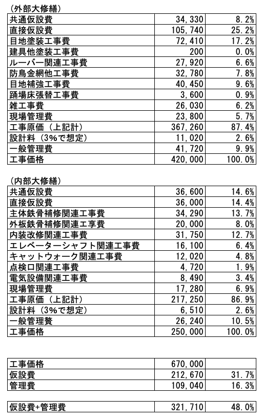 ①②は平成29年調査における内部と外部の大規模修繕の概算です。内容を見ると、一回あたりの内・外部修繕工事の経費合計は6億7000万円ですが、共通・直接仮設費と現場・一般管理費の合計は3億2171万円であり、実に工事価格の48%を占めます。